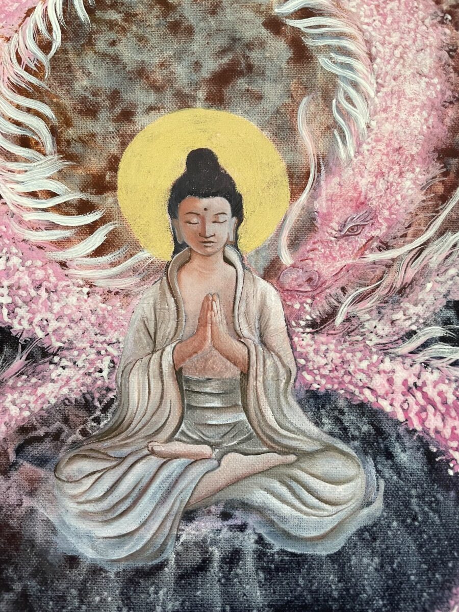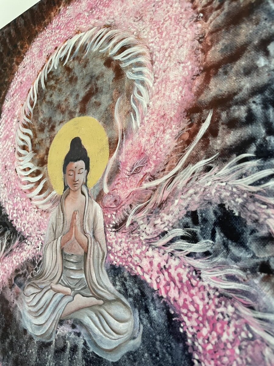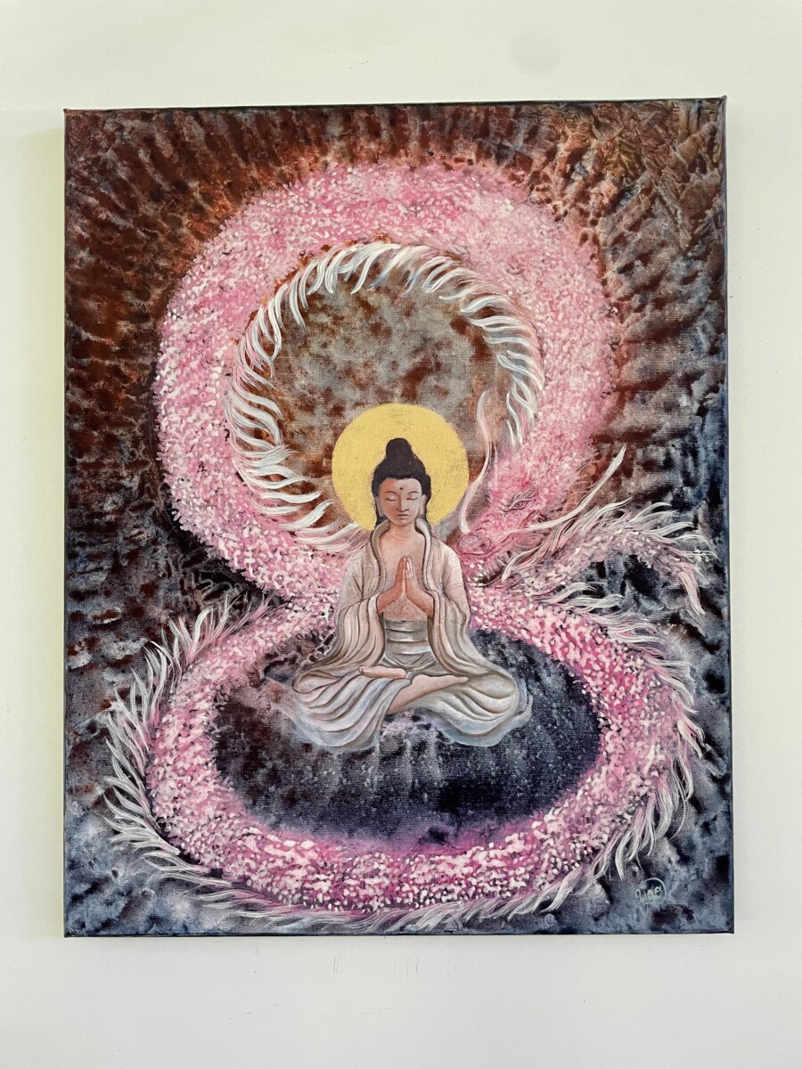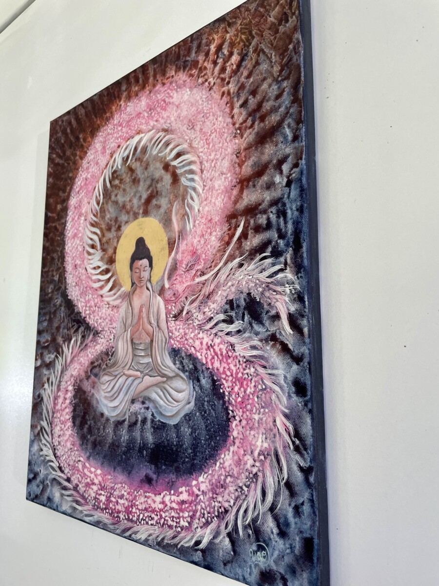 This painting depicts the infinite dragon encircling Guanyin, the Bodhisattva of Compassion — a meeting of wisdom and serenity.